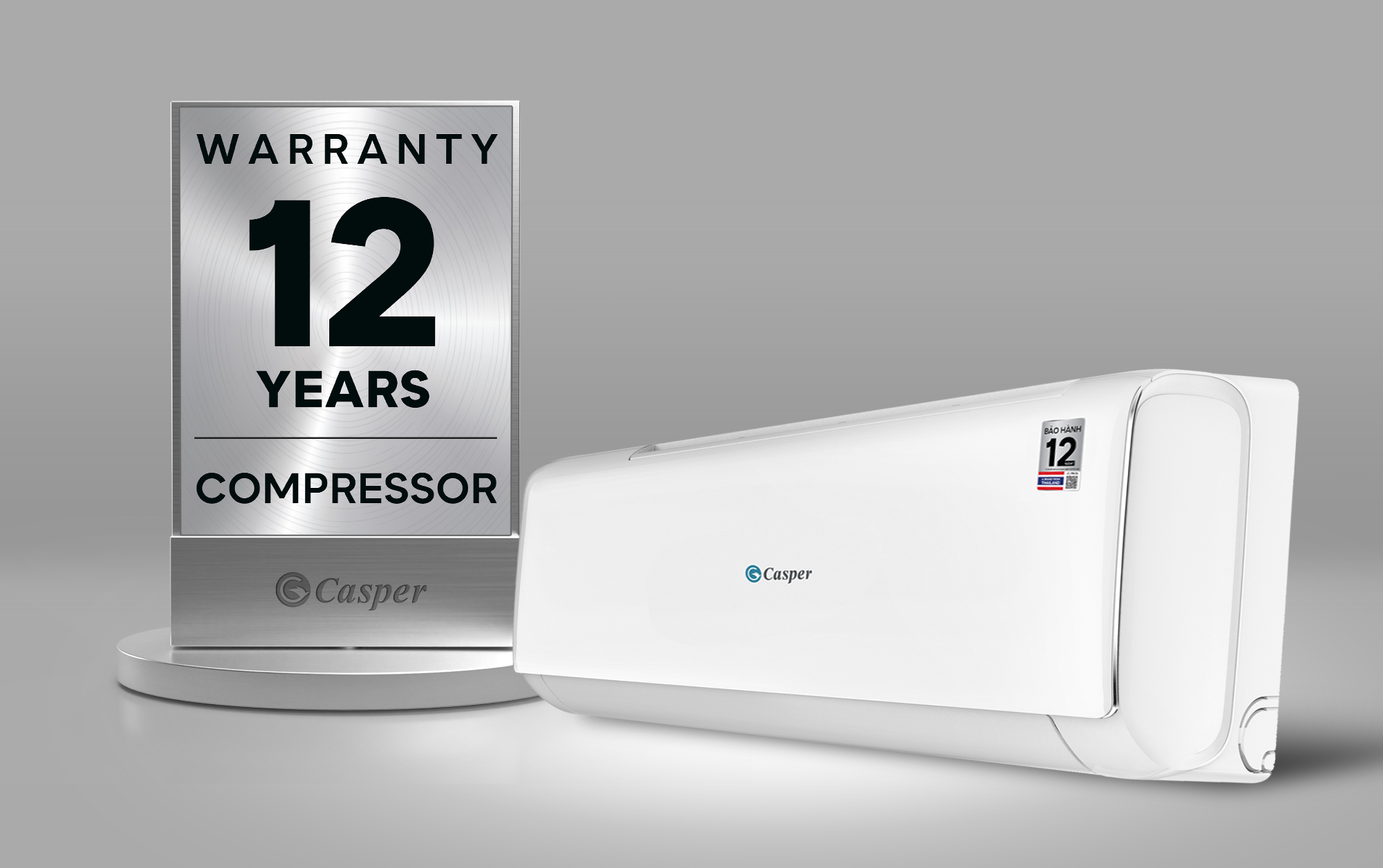 Điều hoà dân dụng Casper được nhập khẩu nguyên chiếc từ Thái Lan, với chế độ bảo hành máy nén lên đến 12 năm – cao nhất thị trường, giúp người dùng yên tâm về chất lượng và độ bền trong thời gian dài sử dụng.